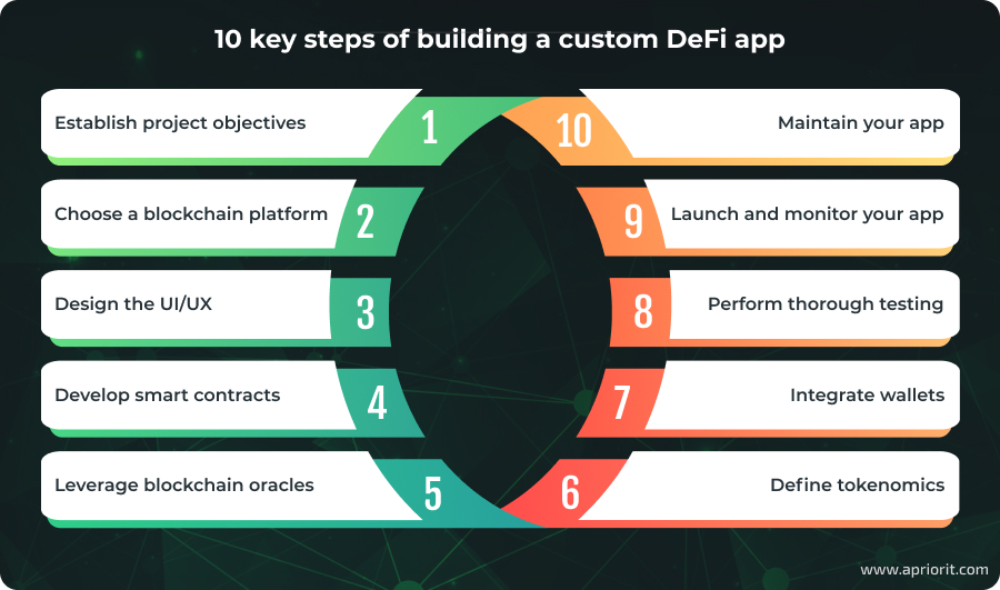 The steps of building DeFi apps can vary depending on the purpose of your solution and choice of features, but in most cases, they include the following: