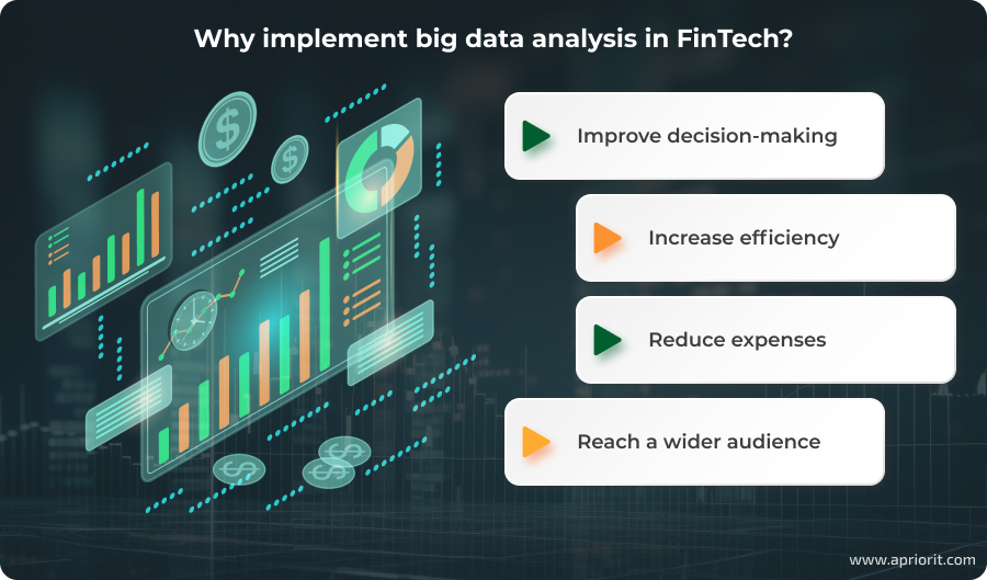 FinTech companies are integrating and analyzing big data to stay competitive on the market. Insights from extensive datasets help businesses improve their own workflows, enhance decision-making processes, offer personalized services to end-users, and better react to ever-changing market trends.