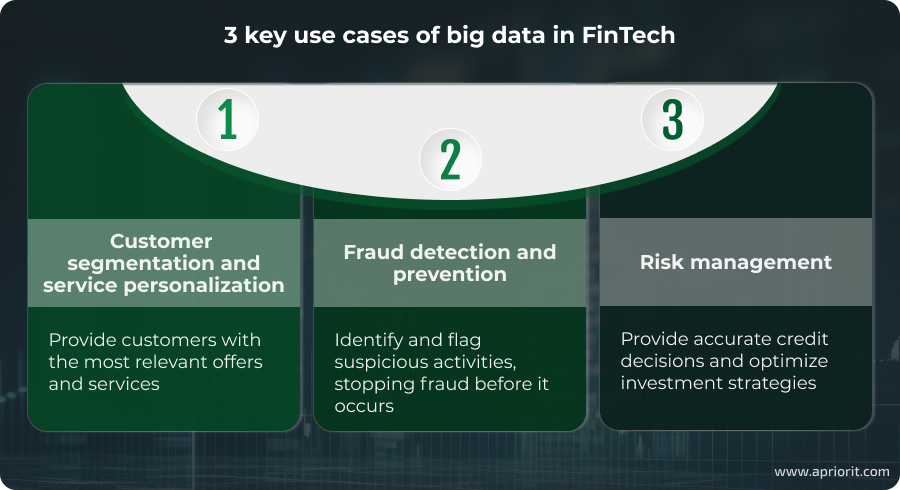 Extensive financial, customer, and market datasets can offer significant advantages to FinTech businesses. By extracting key insights into customer behavior, preferences, historical trends, and market conditions, companies can make more informed decisions and optimize their strategies. With this information in mind, let’s explore practical examples of using big data for FinTech.