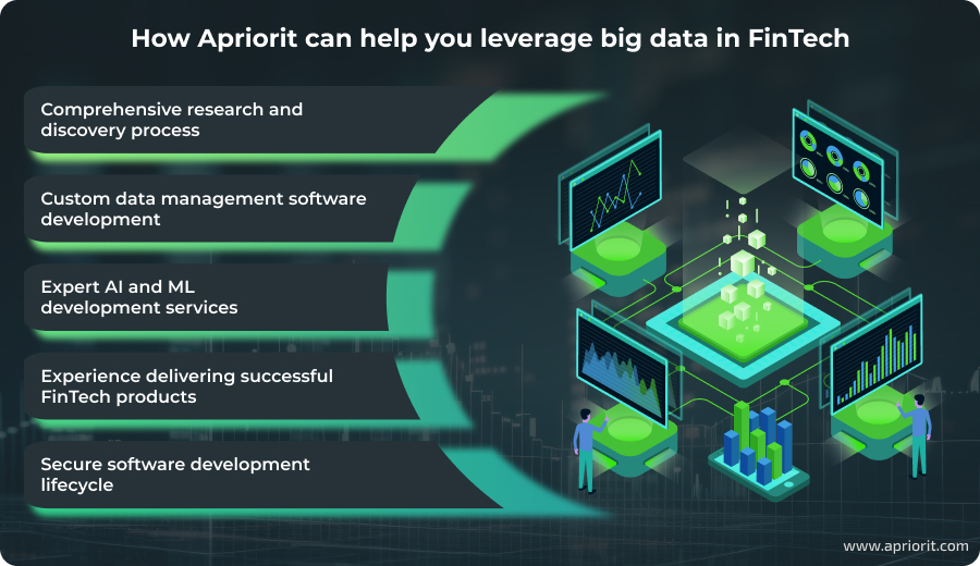 If you want to create a FinTech product or enhance an existing solution with big data algorithms, artificial intelligence, or machine learning, feel free to contact Apriorit. Our experts know how to implement big data analytics in your project and are ready to help. We’ll gladly assist you with all steps of efficient FinTech software development, including comprehensive research and discovery processes, AI and ML integration, and advanced data management software development.