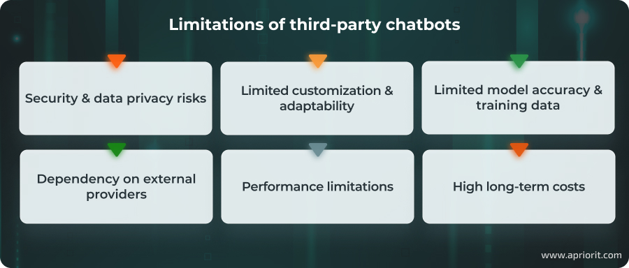 Being less expensive compared to custom solutions in the short run, off-the-shelf and prompt-based chatbots look like attractive options. However, they come with significant drawbacks that may be critical depending on your particular type of business. In this section, we discuss limitations of ready-made and prompt-based chatbots and explore what businesses should consider when developing a custom chatbot.