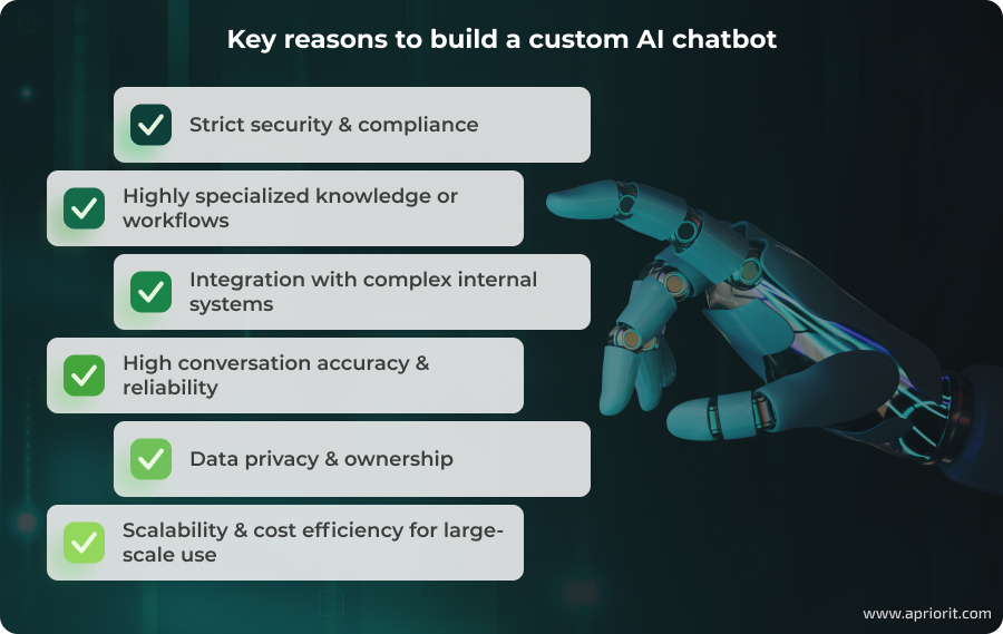 You should consider building a custom chatbot instead of relying on off-the-shelf or prompt-based solutions if your business requires: