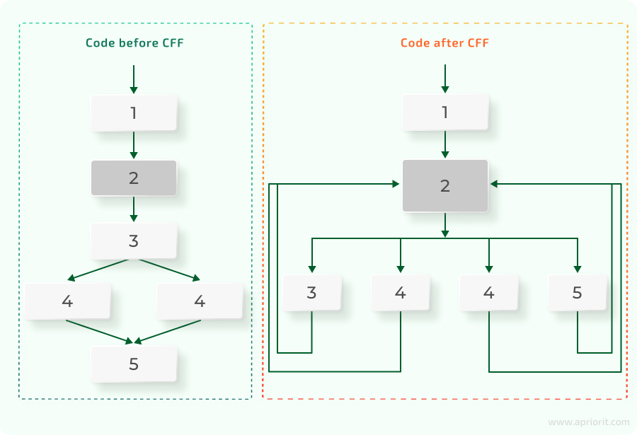 Control Flow Flattening (CFF) helps developers to hide real logical connections between different parts of code, making those connections look nonlinear. Usually, CFF implementation means putting a method’s logic into a single, centralized, switch statement. Here’s an example of how CFF looks in block schemes:
