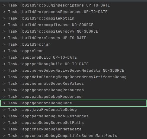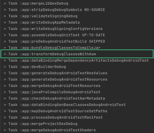 }Now, if we rebuild our project, we’ll see a new task: transform<variant>ClassesWithAsm: