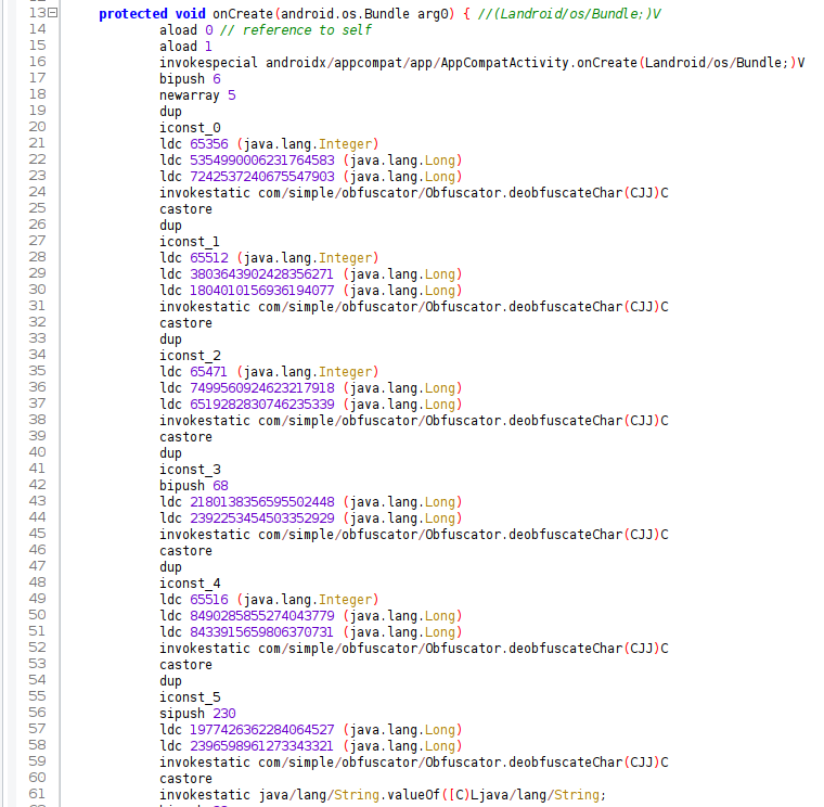 }Now, let’s move to the ObfuscatorMethodVisitor class for the most interesting part of the bytecode transformation. Since we will only obfuscate constant strings, we’ll need to analyze the LDC instruction. Therefore, we need to override the visitLdcInsn function. If its value is a string, we add obfuscation; if not, we call the parent visitLdcInsn function.