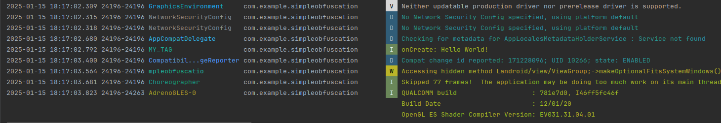 ){}To check how the plugin works, let’s add logging (with two constant strings) to the onCreate function in the MainActivity class at the app level: